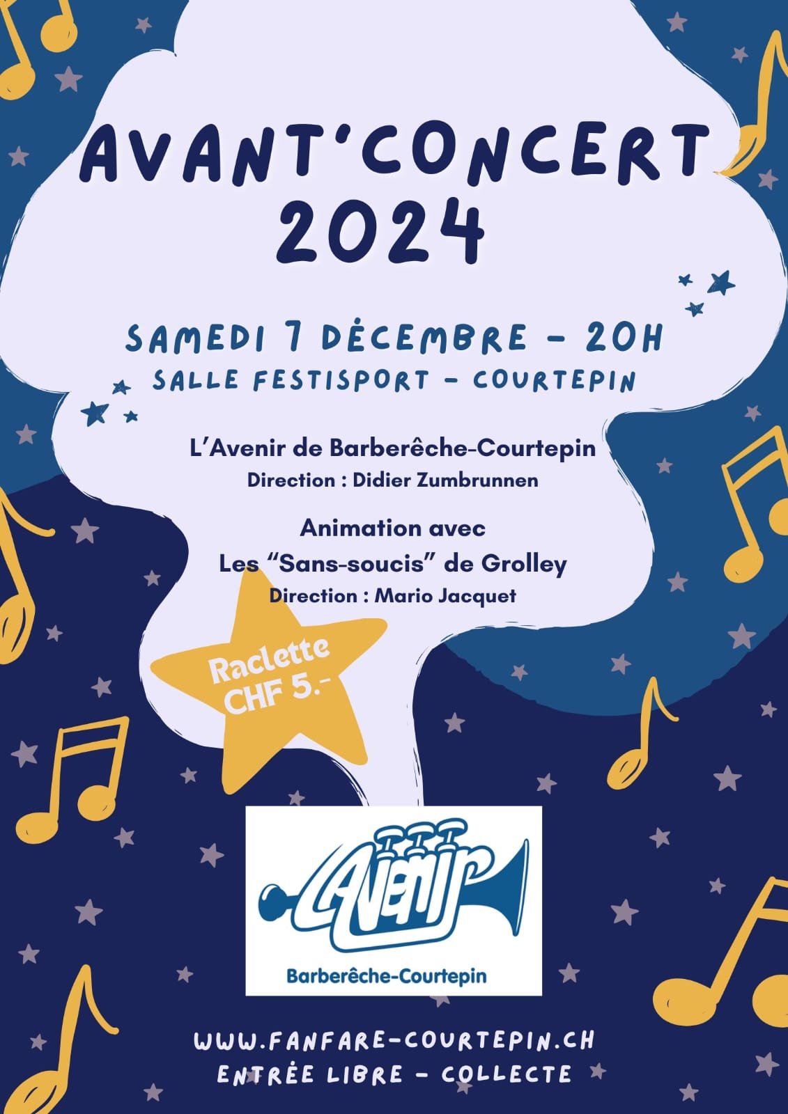 L’Avenir de Barberêche-Courtepin à le plaisir de vous convier à son AvAnt’Concert qui aura lieu le 07.12.2024 à 20h00 à la Festisport de Courtepin.