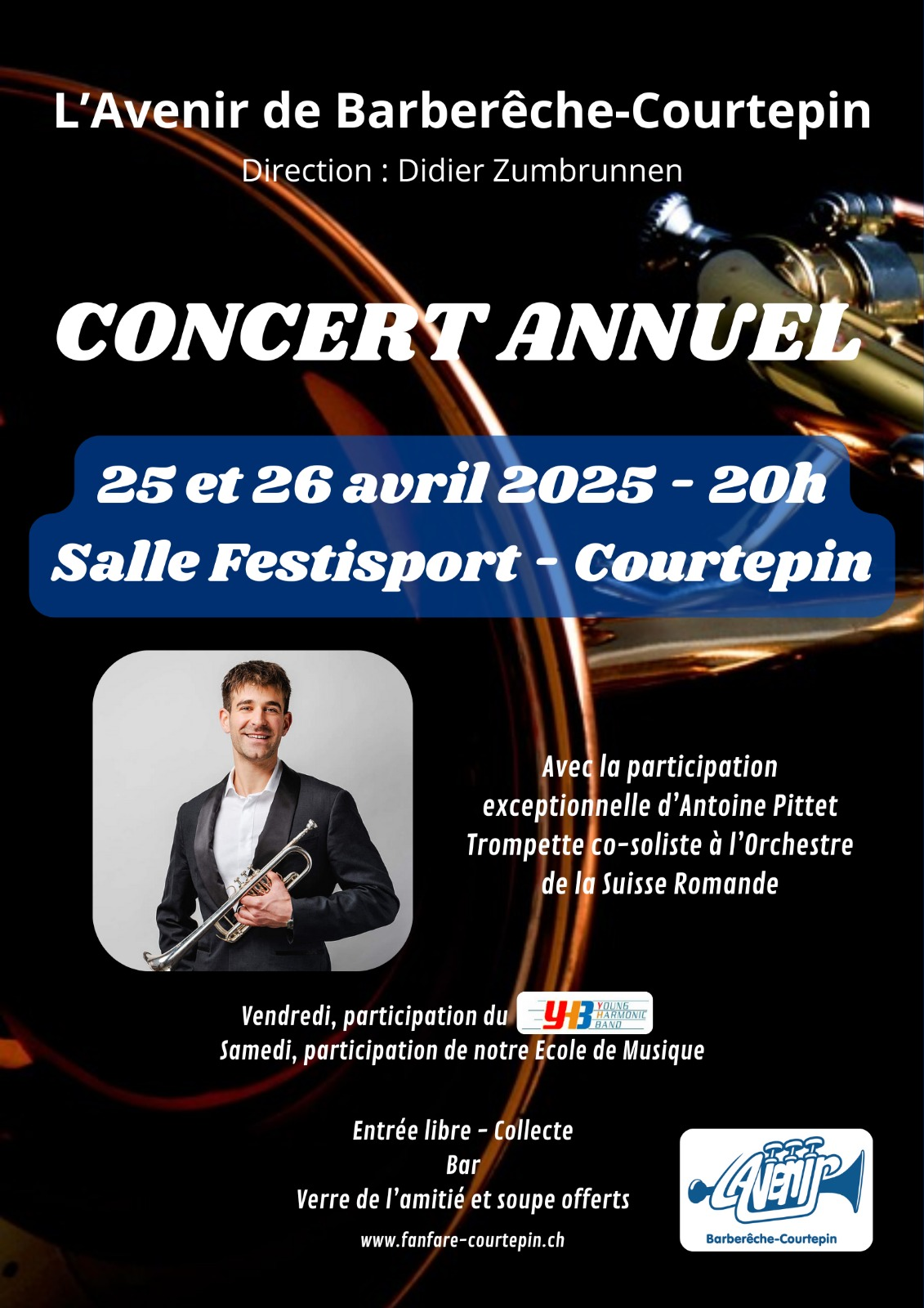 Ne manquez pas notre concert annuel qui aura lieu les 25 et 26 avril à 20h! Rejoignez-nous pour une soirée musicale et une ambiance sympa à la Festisport de Courtepin.